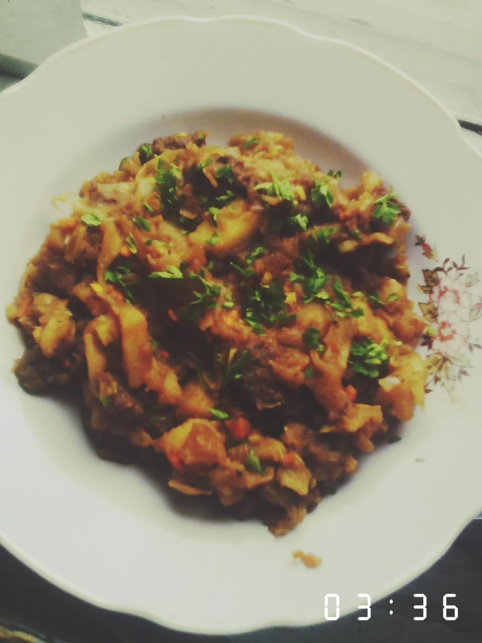 ШАГ 3 Полученную смесь соединяем с потушенной в отдельной кастрюле говядиной, нарезанной кубиками.