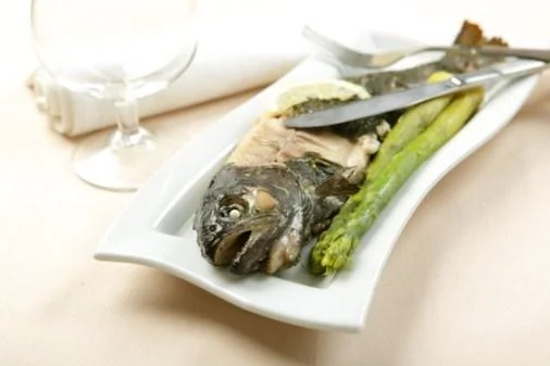 ШАГ 3 Извлеките из духовки, срежьте бумагу и подавайте с соусом, слегка припущенной спаржей и дольками лимона.