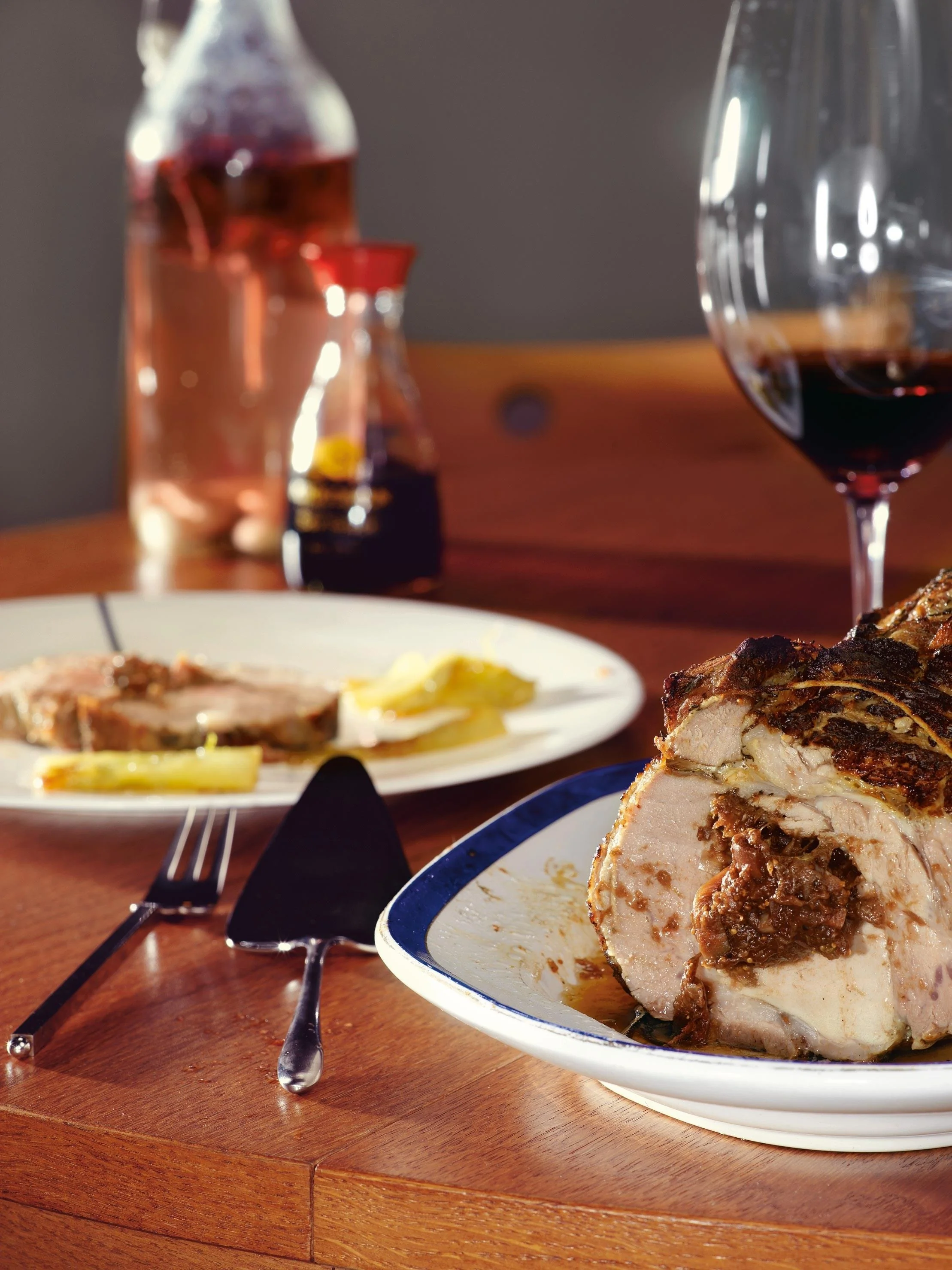 ШАГ 5 В свиной шейке сделать продольный разрез, а потом разрезы поперечные, чтобы получилось нечто вроде кармана. Заложить в него фарш. Кусок мяса перевязать кулинарной ниткой, образуя пузатую гусеницу. Вязать нужно аккуратно, чтобы начинка не вылезла наружу.