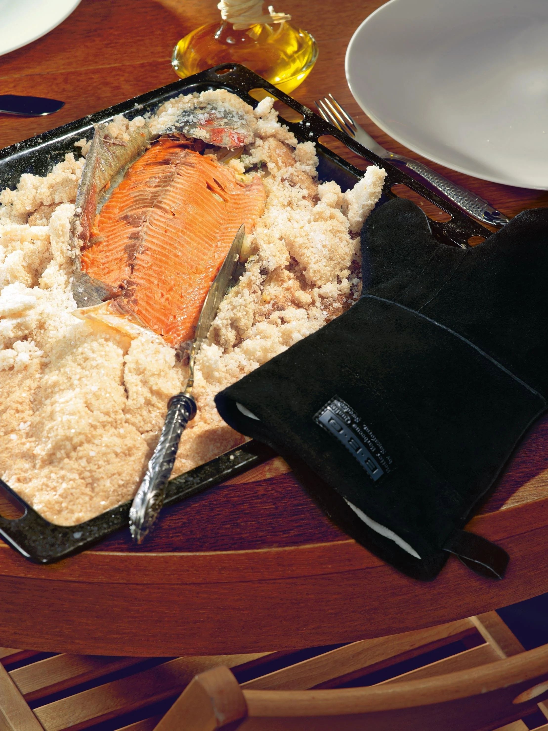 ШАГ 5 Вынуть из духовки, разбить запекшуюся соляную корку плоской стороной большой ложки, счистить соль, переложить рыбу на блюдо, спрыснуть смесью оливкового масла и лимонного сока — и подавать.