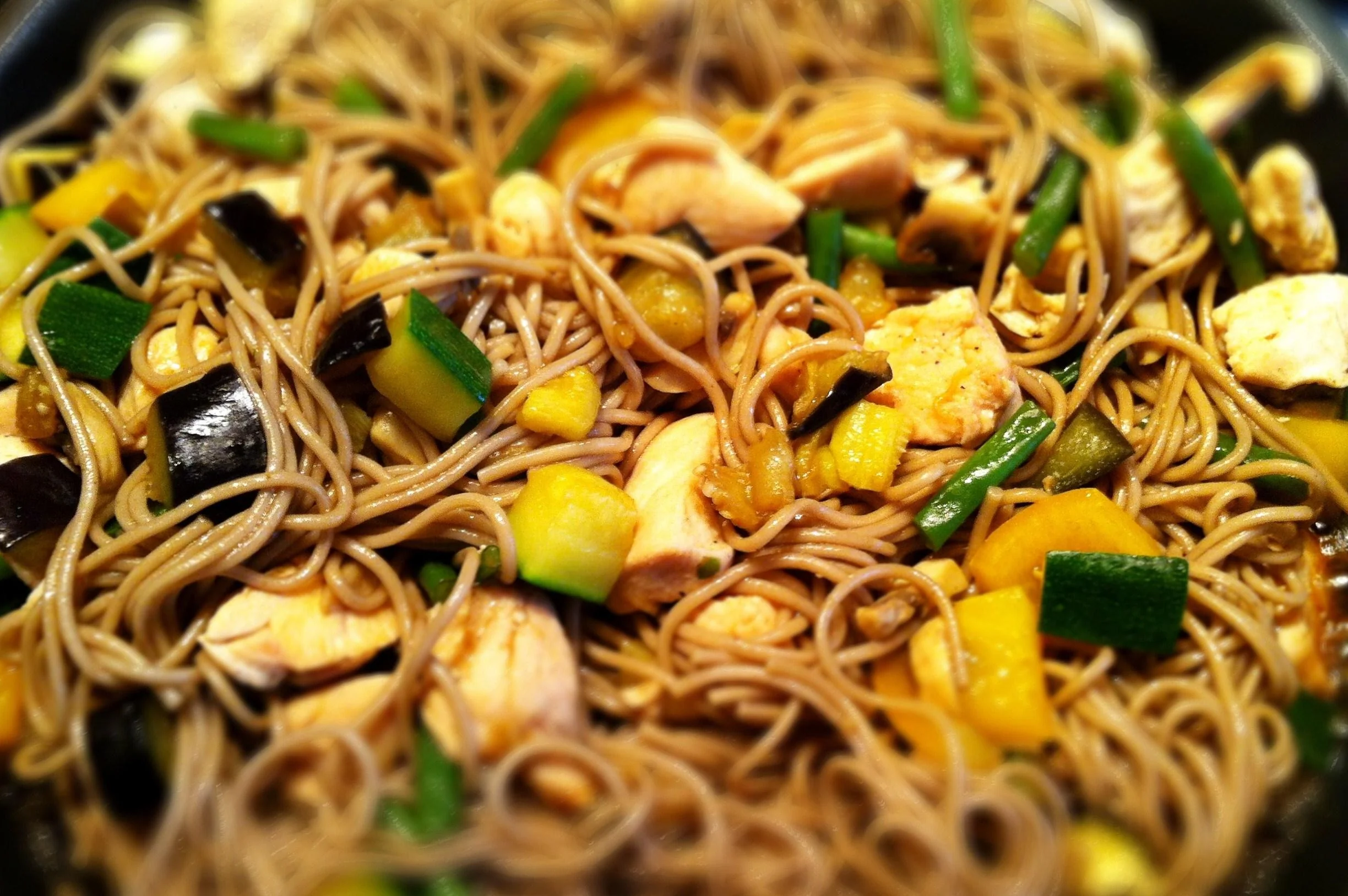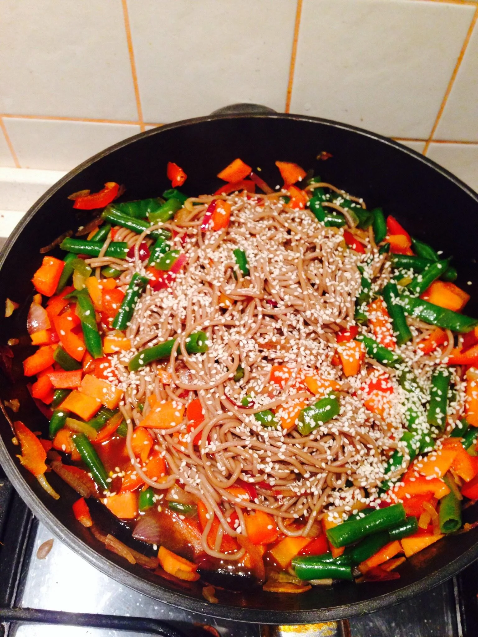 ШАГ 6 Влить в овощную смесь соевый соус, добавить лапшу, оставить томиться в сковороде еще на пару минут, при желании добавить еще соевого соуса.
