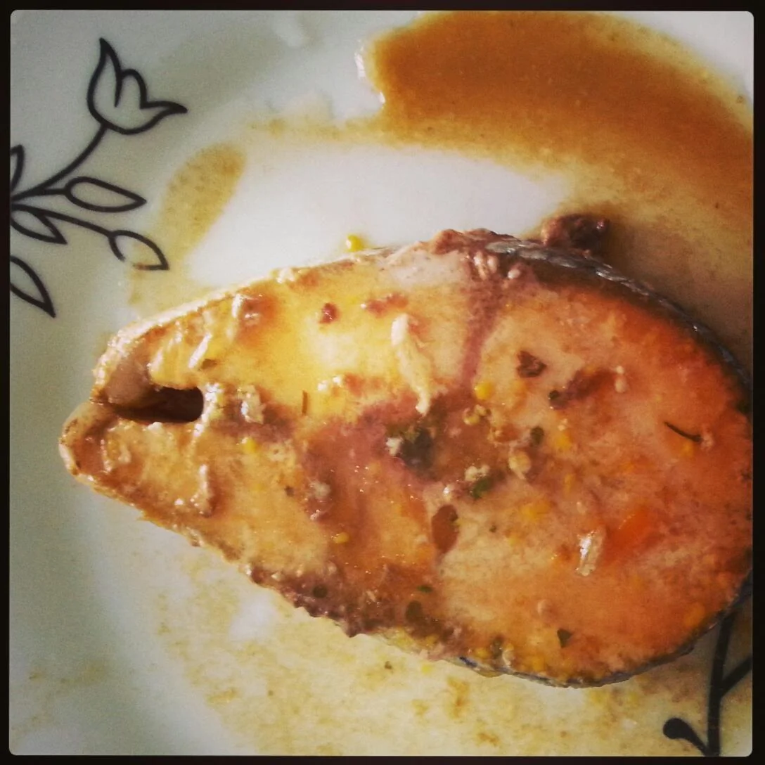 ШАГ 3 Режем лосось порционными кусками выкладываем в форму, заливаем маринадом и даем постоять минут тридцать.