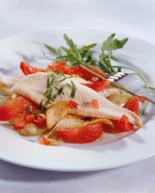 Рыбное филе, тушенное с помидорами, зеленью и чесноком