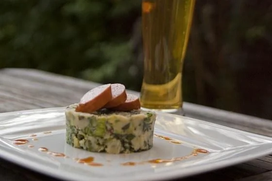 ШАГ 5 В горячее пюре постепенно добавлять нарезанный салат, пока картофель не возьмет все 450 грамм. Выкипевшее вино процедить. Сосиску вынуть из упаковки и нарезать кольцами.