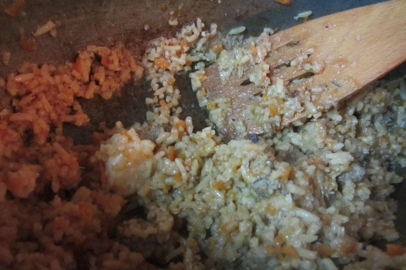 ШАГ 5 По готовности следует выключить огонь и, не перемешивая, дать плову постоять минут 10-15. Затем все тщательно перемешать и оставить постоять еще минут 5.