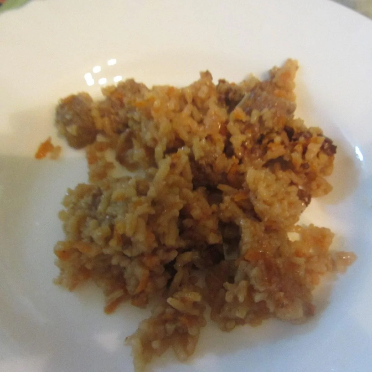 ШАГ 4 Рис предварительно промыть под холодной водой и замочить (воду стоит менять раз 5). Очистить зубчики чеснока от верхней шелухи и корней. Положить в казан к мясу и сверху плотно засыпать рис, придавливая шумовкой. Залить водой так, чтобы от поверхности воды до слоя риса расстояние было примерно равно одной фаланги пальца (около 2 см). Добавить соль по вкусу, специй, накрыть крышкой и оставить на медленном огне на 30 минут.