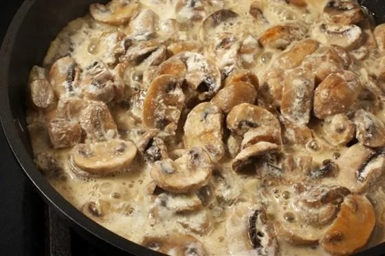 ШАГ 2 В разогретое масло положить нашинкованный лук, посолить его и тушить до мягкости, после чего добавить стакан сметаны, вскипятить и полученной подливкой залить грибы.
