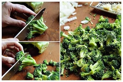 ШАГ 3 Возвращаемся к фаршу: добавляем в него брокколи (на самом деле, вместо брокколи можно добавлять и цветную капусту, и лук-порей, чего только душа пожелает!), пару столовых ложек куриного бульона и тушим под крышкой на медленном огне около 5 минут.