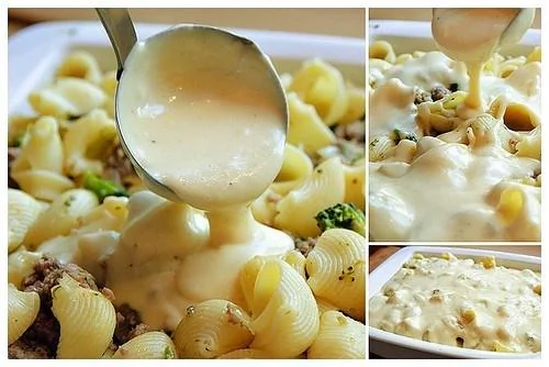 ШАГ 4 Займемся соусом. В 100 грамм растопленного масла на медленном огне добавляем 5 столовых ложек муки, постоянно помешивая, в течении минуты. Затем постепенно вливаем туда 2 стакана молока (можно 3, в зависимости от желаемого количества соуса), добавляем 1–2 чайные ложки дижонской горчицы и солим (я добавляю 1 чайную ложку соли, но это по вкусу — имейте ввиду, что в соус мы добавляем сыр!). Оставляем соус кипеть на очень медленном огне на несколько минут. Затем добавьте в соус щепотку кайенского перца и тертый сыр (можно использовать пармезан, Гауду, Чеддер и другие — на ваш вкус).
