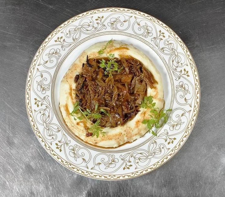 ШАГ 8 В середину картофельного кольца поместить печень с луком, полить соусом из бульона или демигляса, оставшимся в сковороде, и украсить готовое блюдо парой веточек петрушки. Другой классический гарнир к печенке — полента, кукурузная каша, которую венецианцы запекают в духовке и потом нарезают на порции.