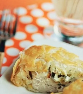 ШАГ 4 Взять листы слоеного теста, поместить в каждый из них по нафаршированному куриному филе и завернуть, смазывая края теста яйцом для склеивания. После того, как филе завернули, еще раз смажьте все швы яйцом.
