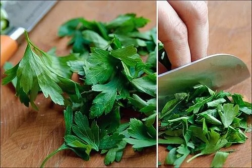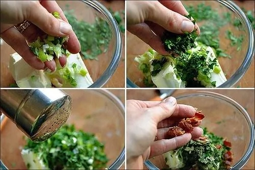 ШАГ 2 Нарезать зеленый лук и мелко покрошить петрушку, перемешать, поперчить, добавить сливочный сыр (я брала «Парижскую буренку»), добавить немного чеснока, кусочки бекона, еще раз все хорошенько перемешать.