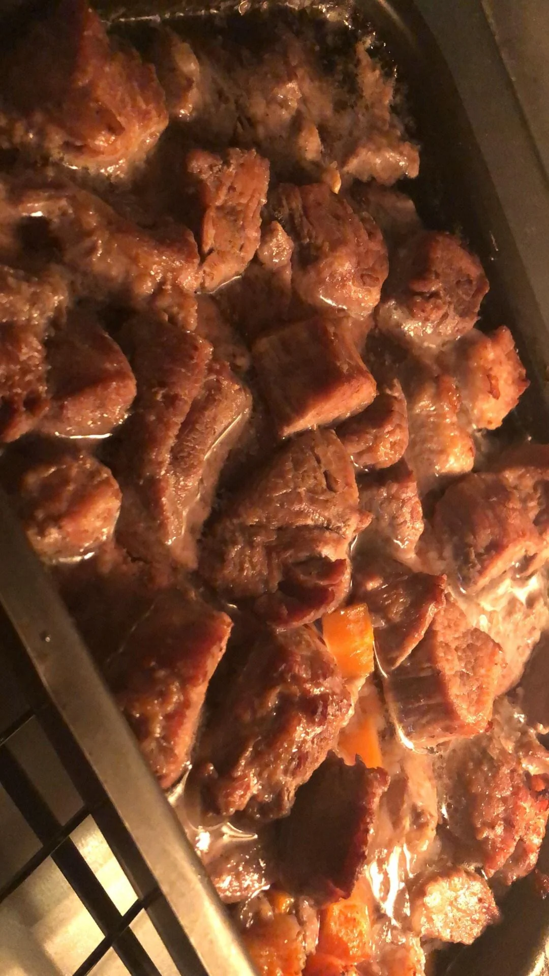 ШАГ 3 Переложить содержимое сковороды в толстостенную кастрюлю, глубокий сотейник или чугунок. Важно выложить мясо очень плотно в один или 2 слоя, в зависимости от диаметра емкости. Добавить горячую воду в уровень с мясом и поместить емкость в духовку, разогретую до 140 градусов на 2 часа. Хорошего результата можно добиться и на плите. В любом случае нужно, чтобы посуда была прикрыта крышкой так, чтобы щель была минимальной, а жидкость даже не кипела, а была «чуть живой».