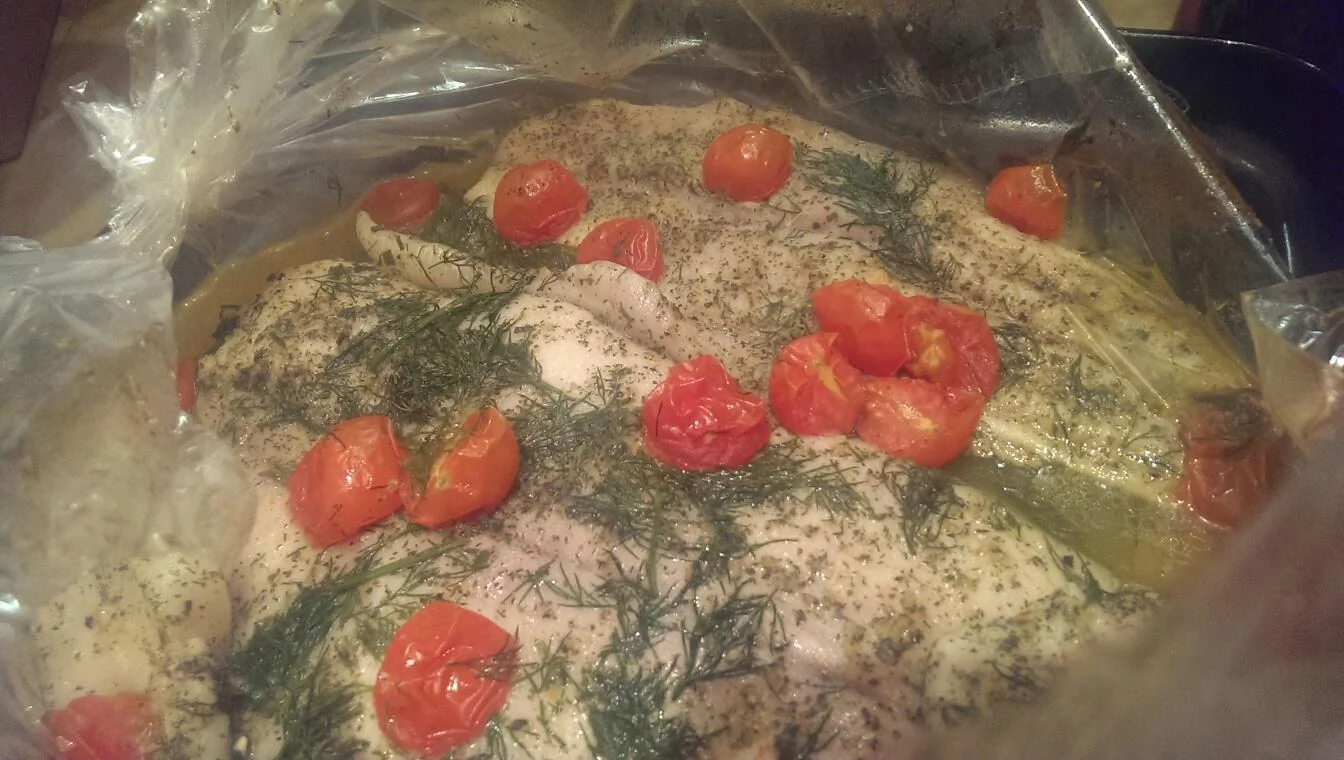 ШАГ 3 Уложить рыбу в пакет для запекания, добавить разрезанные на половинки помидоры черри и зелень.