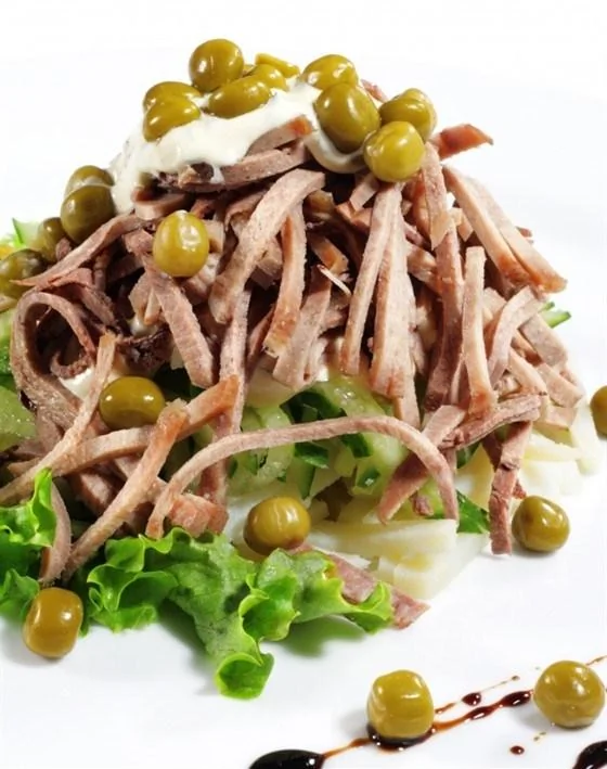 ШАГ 2 Очищенный язык нарезать тонкими ломтиками, уложить на блюдо, полить 2-3 ст. ложками бульона и растопленным маслом. На гарнир положить зеленый горошек, заправленный маслом.
