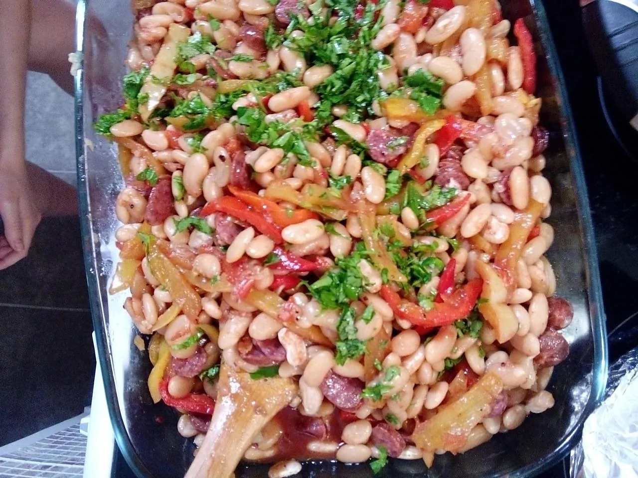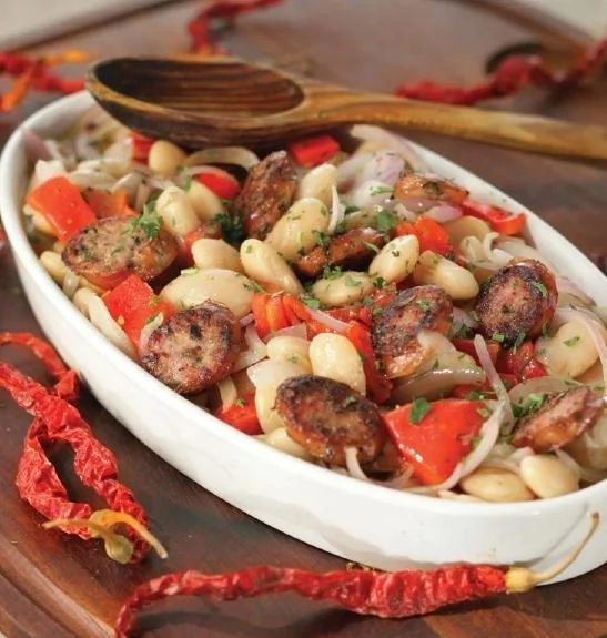Белая фасоль, запеченная с красным перцем и острыми колбасками