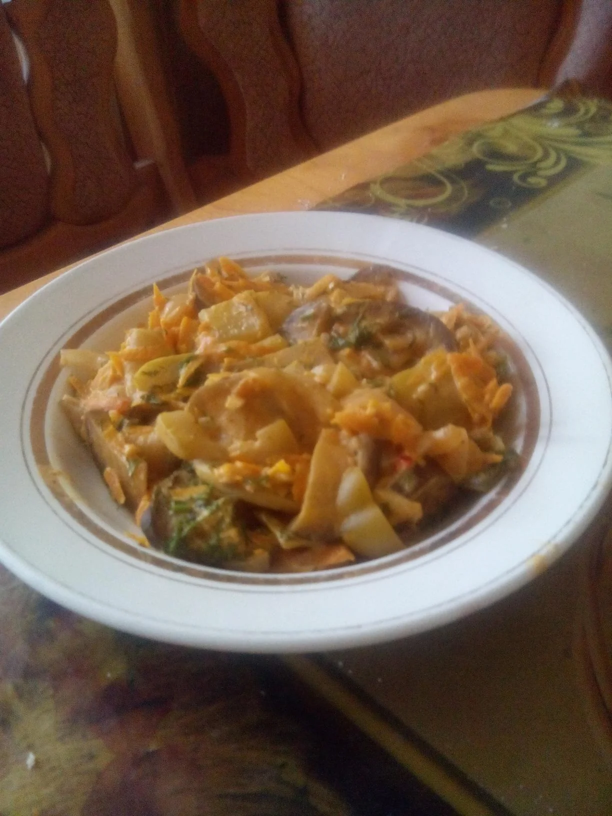 ШАГ 3 Все забросить в большую кастрюлю, залить сметаной, добавить полстакана воды, и поставить тушиться. Когда закипит, посолить, добавить чеснок и куркуму, любые другие специи по вкусу, поперчить.