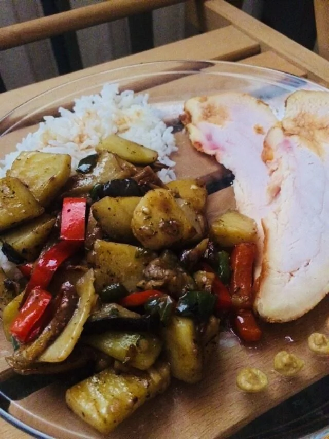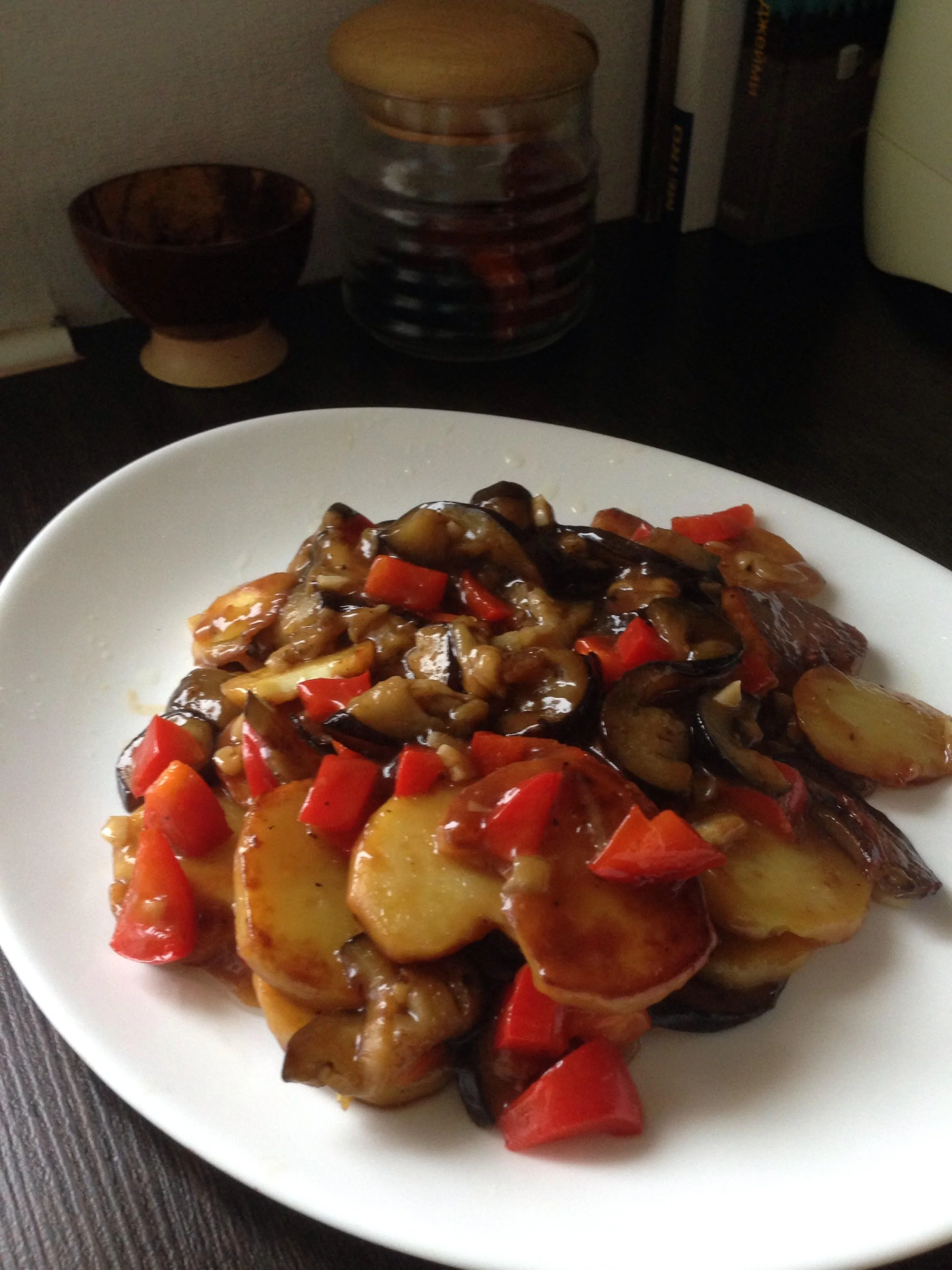 ШАГ 2 Картофель обжарить на масле до получения хрустящей корочки и выложить его на тарелку. На этом же масле обжарить баклажаны. Когда баклажаны станут мягкими — добавить к ним обжаренный картофель, соевый соус, вылить разведенный крахмал. Тщательно все перемешать. Как только крахмальный соус станет тягучим и прозрачным — плиту выключить, добавить чеснок и зеленый перец. Блюдо готово.