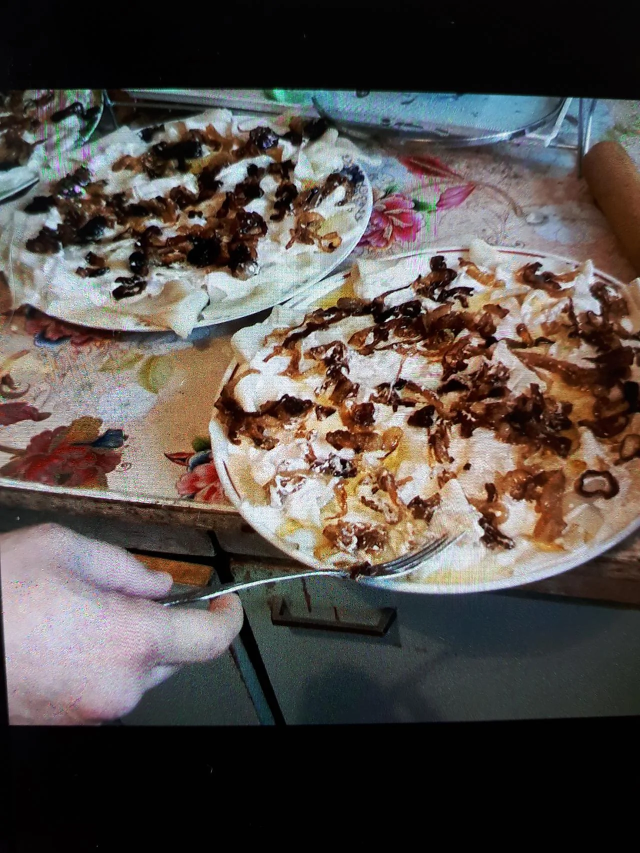ШАГ 6 На широкую тарелку выложить сваренное тесто, сверху соус из простокваши, сверху пассерованный лук.