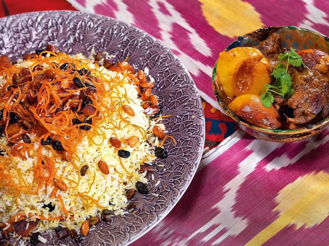 ШАГ 9 Готовый плов перемешать с сухофруктами и подавать. На другое блюдо выложить хореш.