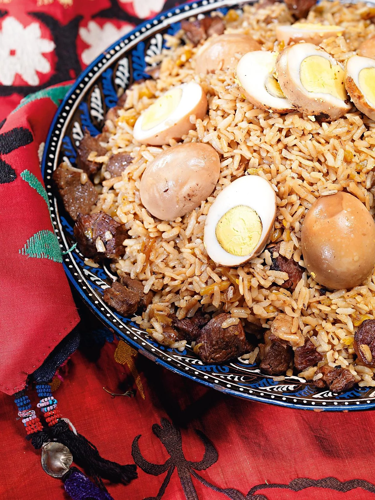ШАГ 2 Сделать ферганский плов, следуя рецепту, вплоть до пятого пункта. После того как в курдючном жире будет обжарено мясо с овощами, сгрести все это в одну сторону на стену казана, а на дне в жире обжарить вареные яйца, переворачивая их, чтобы вся их поверхность покрылась золотистой патиной. Тогда накрыть их мясом и овощами, залить водой и дальше следовать рецепту.