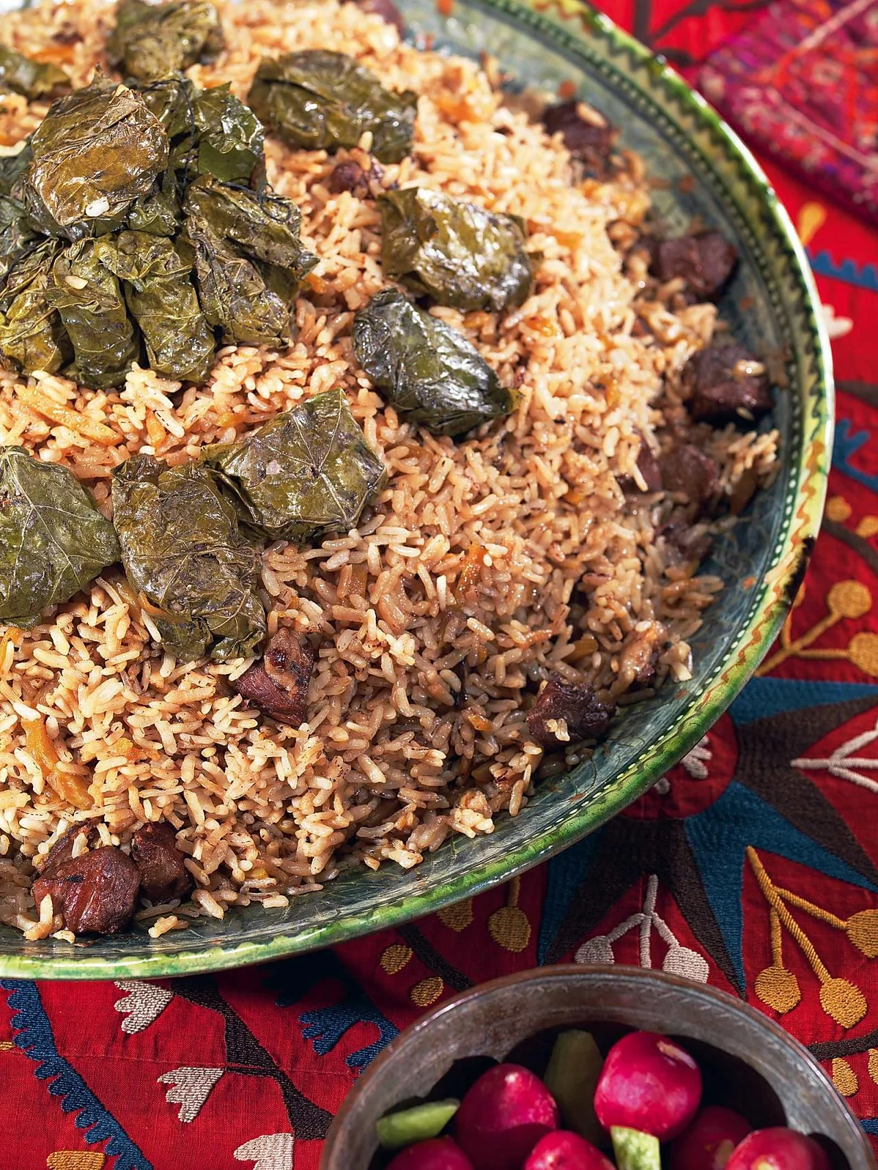 ШАГ 7 Готовить ферганский плов дальше по рецепту. В шестом пункте, после того как закипит вода с мясом и овощами, убавить огонь и положить в зирвак долму. Томить ее тридцать-сорок минут, пока не сварятся виноградные листья. Тогда вынуть долму и заняться рисом, как описано в рецепте.
