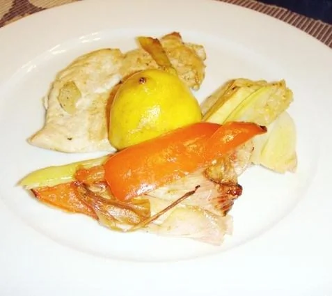 ШАГ 2 Куриную грудку обжарить на гриле в растительном масле до коричневой корочки. Переложить на противень, туда же, на противень, насыпать рубленого порея, сельдерея, приправить курицу солью и перцем, бросить веточки тимьяна и отправить на пятнадцать минут в духовку, разогретую до двухсот градусов.