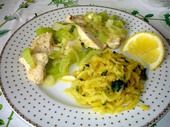 ШАГ 3 Спагетти из цукини слегка припустить на оливковом масле с чесноком и рубленой петрушкой. Как только цукини станет мягким, влить в сковороду лимонный сок, перемешать, посолить, поперчить, снять с огня и подавать к курице.