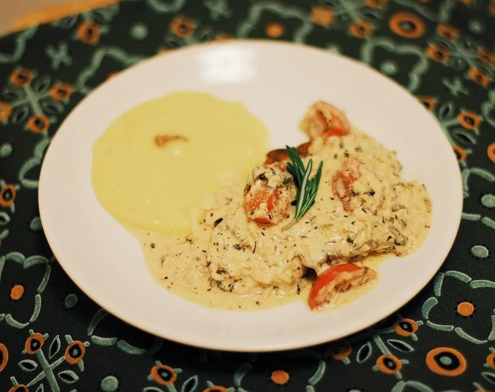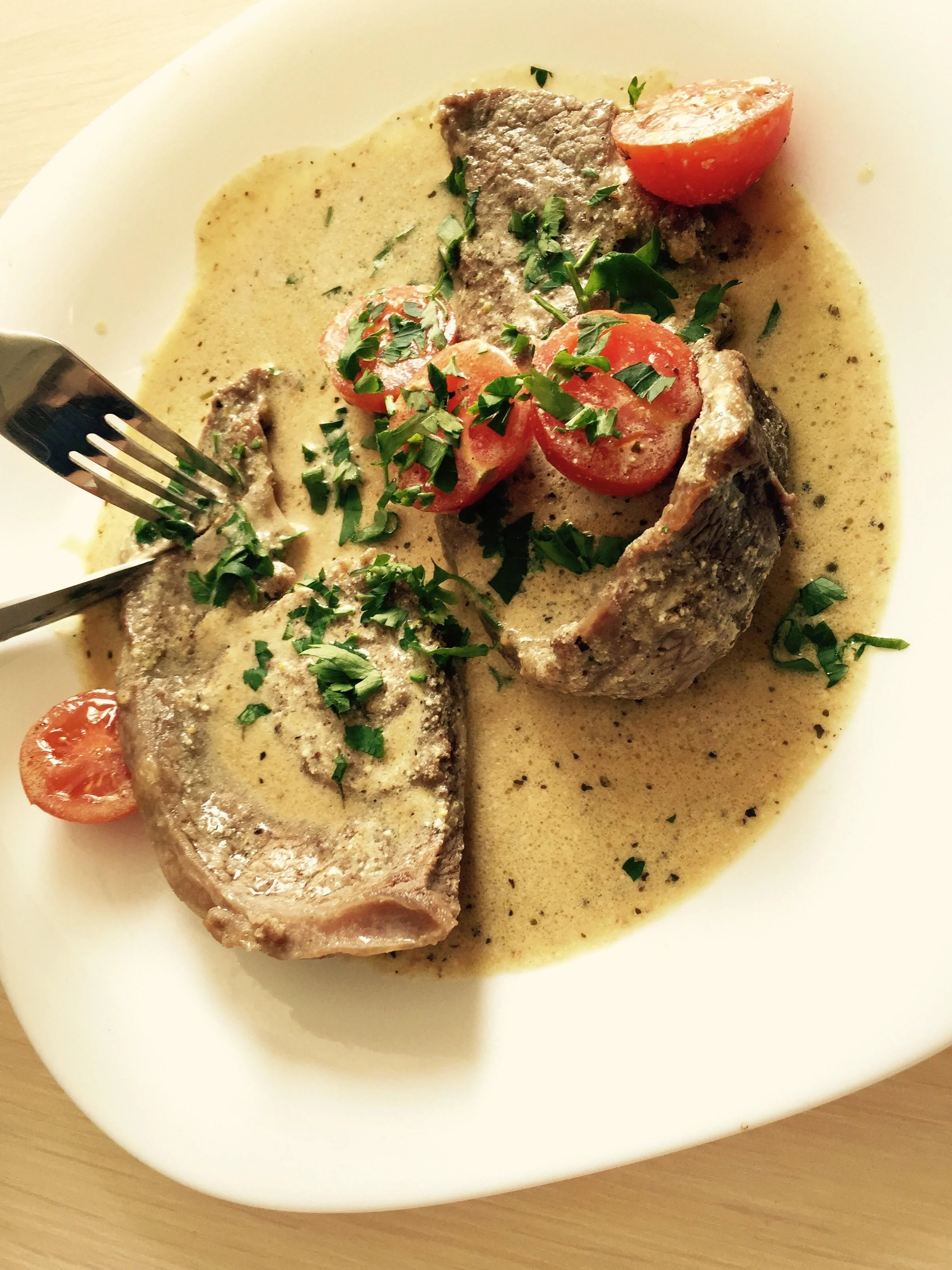ШАГ 5 Переложить готовые медальоны в теплое место, упаковав в фольгу. А в остатки мясного соуса на сковороде, где жарились медальоны, долить винно-сливочный соус, добавить горчицу, посолить, поперчить, взбить венчиком и тушить две минуты, потом добавить помидоры и пряные травы и тушить еще минуту-другую. Полить этим соусом медальоны перед подачей на стол.