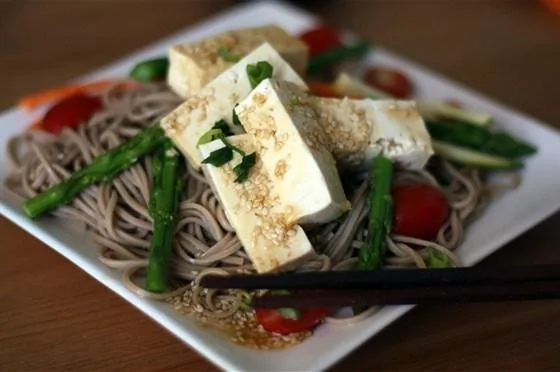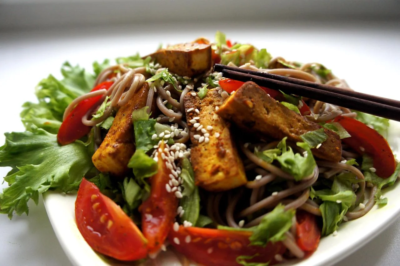 Гречневая лапша с томатами, тофу и базиликом