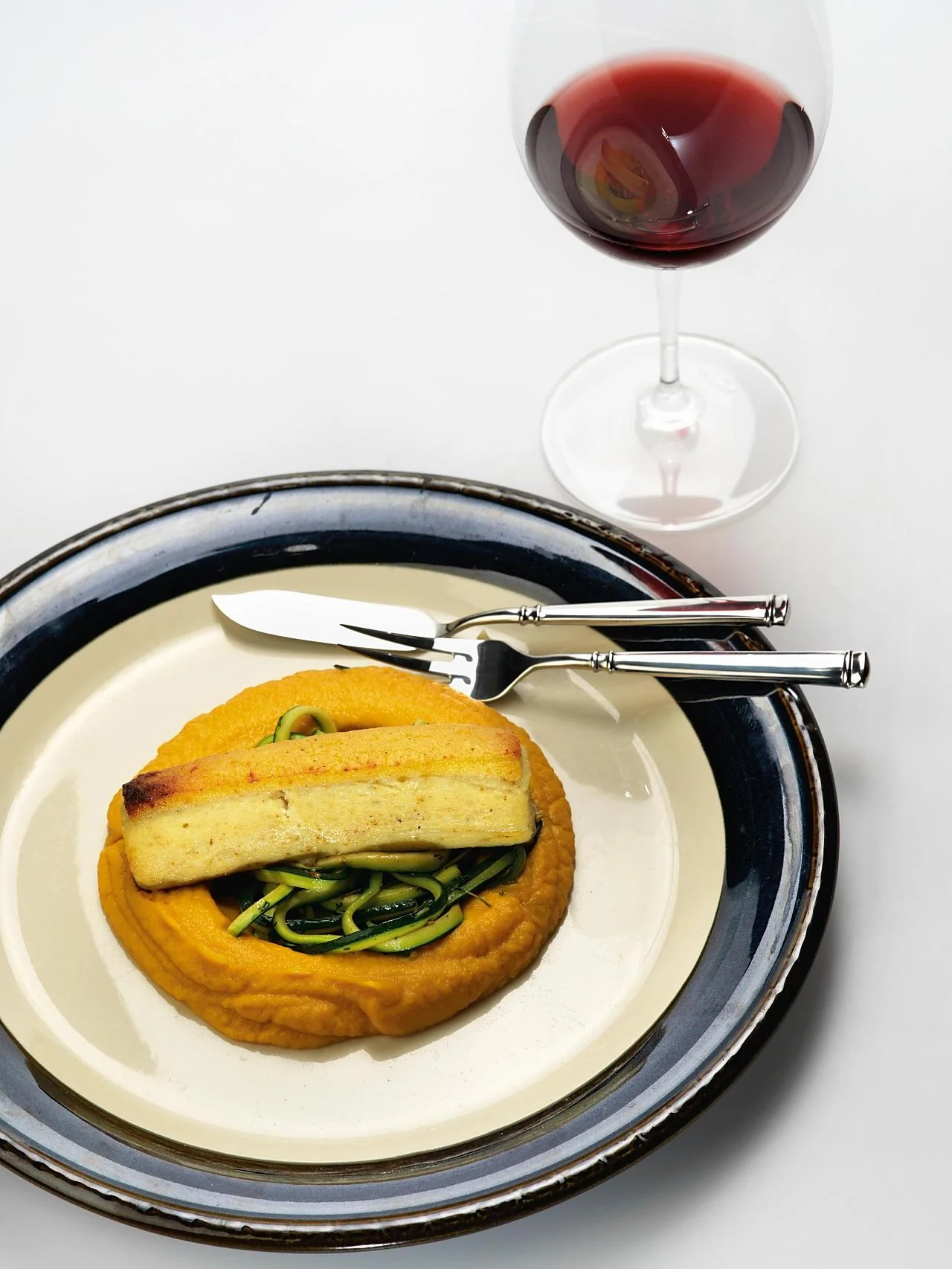 ШАГ 8 Выложить на блюдо бататовое пюре, в центре сделать углубление, в которое положить спагетти из цукини. Снять с колбасок пленку, положить сверху по хлебцу и выложить на цукини.