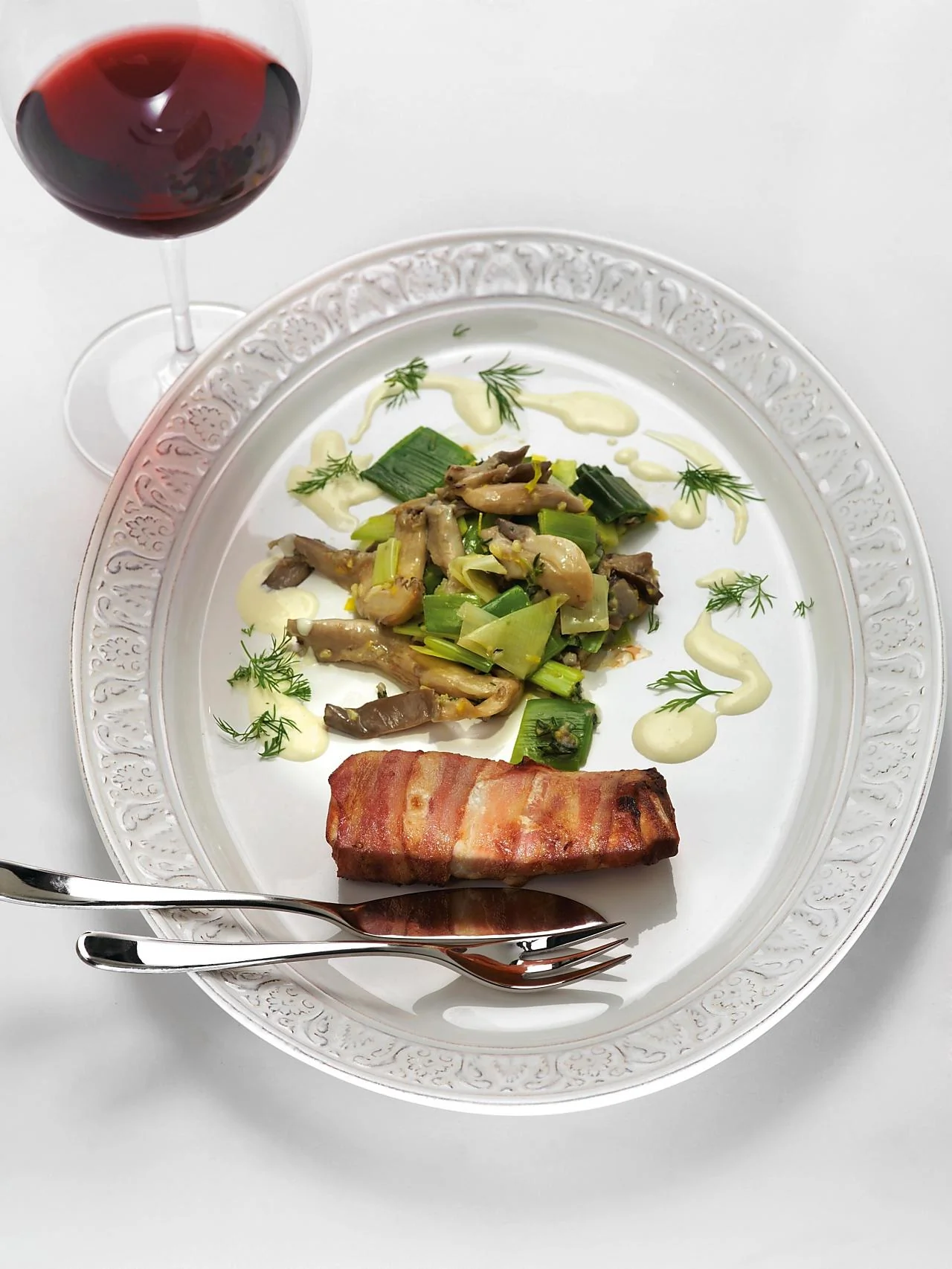 ШАГ 1 Филе разрезать на четыре части. Куски завернуть поочередно в три полоски бекона: когда заканчивается одна, подкладывать на нее следующую, чтобы спираль бекона превратилась таким образом в сплошную ленту. Положить на противень и подержать десять минут в духовке, разогретой до 220 градусов.