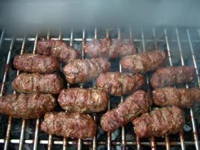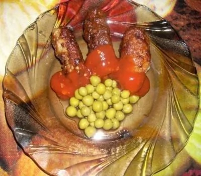 ШАГ 5 Подать мититеи по 2 на порцию, гарнировать солеными огурцами или свежими помидорами, зеленым горошком. При подаче полить соусом муждей, посыпать зеленью.