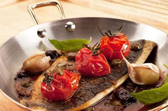 ШАГ 1 На оливковом масле обжарить мелконарезанный лук-шалот и чеснок, добавить каперсы, помидоры черри и оливки, влить вино, дать ему выпариться и влить бульон. Филе дорады положить в кипящий соус, накрыть крышкой и тушить до готовности, в конце крышку снять, дать соусу выпариться, добавить соль и перец.