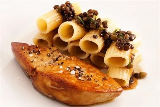 ШАГ 5 Выложить пасту на блюдо. Сверху — обжаренные стейки фуа-гра. Полить оливковым и трюфельным маслом.