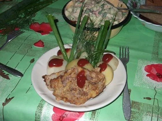 ШАГ 3 Отварить картофель в мундире, очистить. Выложить на сервировочную тарелку картофель, затем кусок отбивной и кусочек жаренного сала.