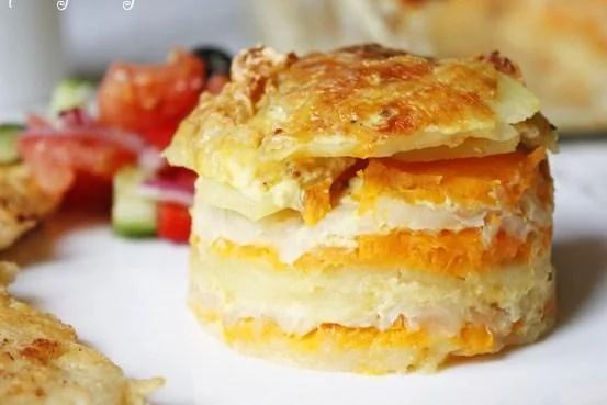 ШАГ 4 Форму для запекания смазать сливочным маслом. Выложить картофель. Смазать сметаной. Сверху выложить кусочки сливочного масла и посыпать сыром.