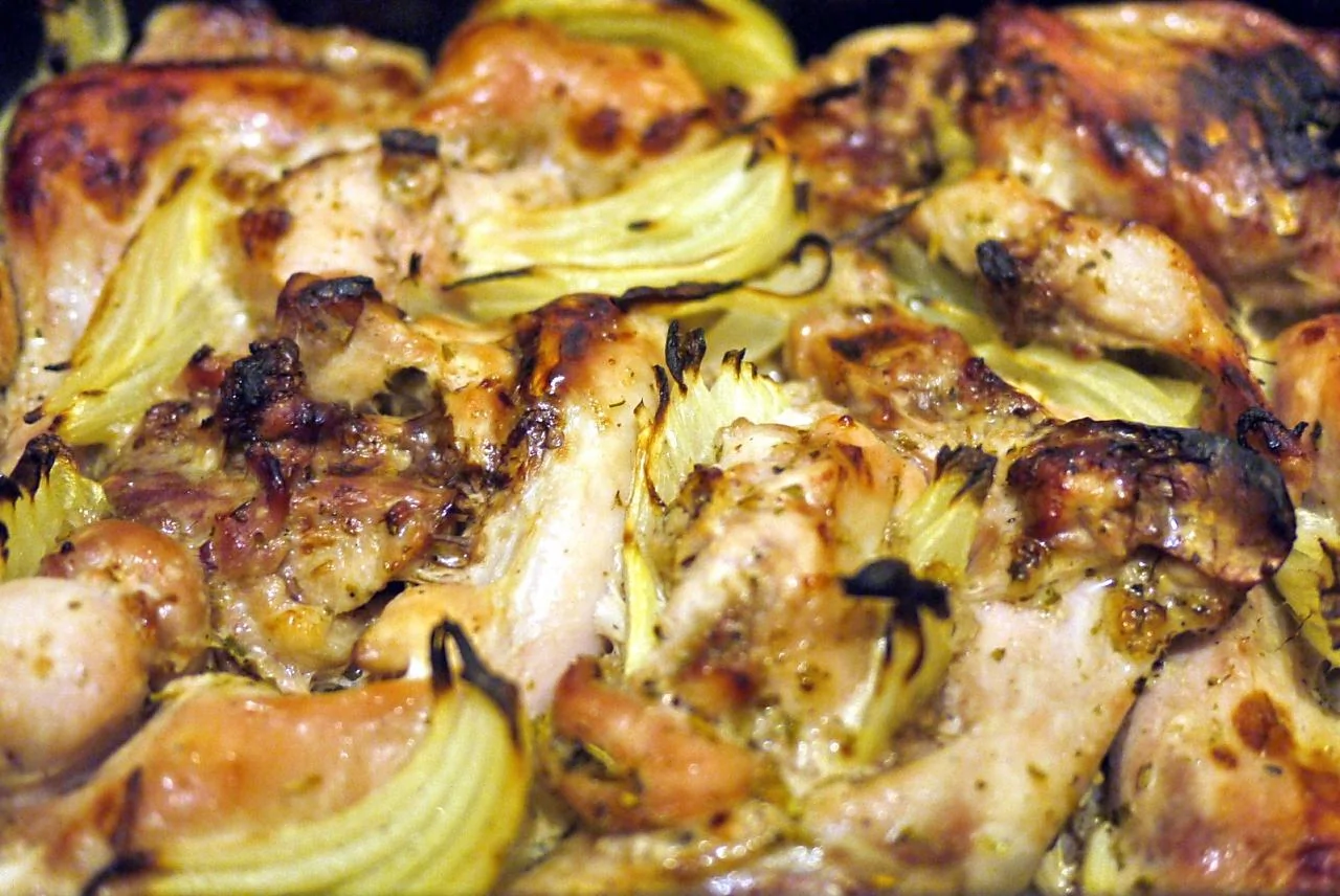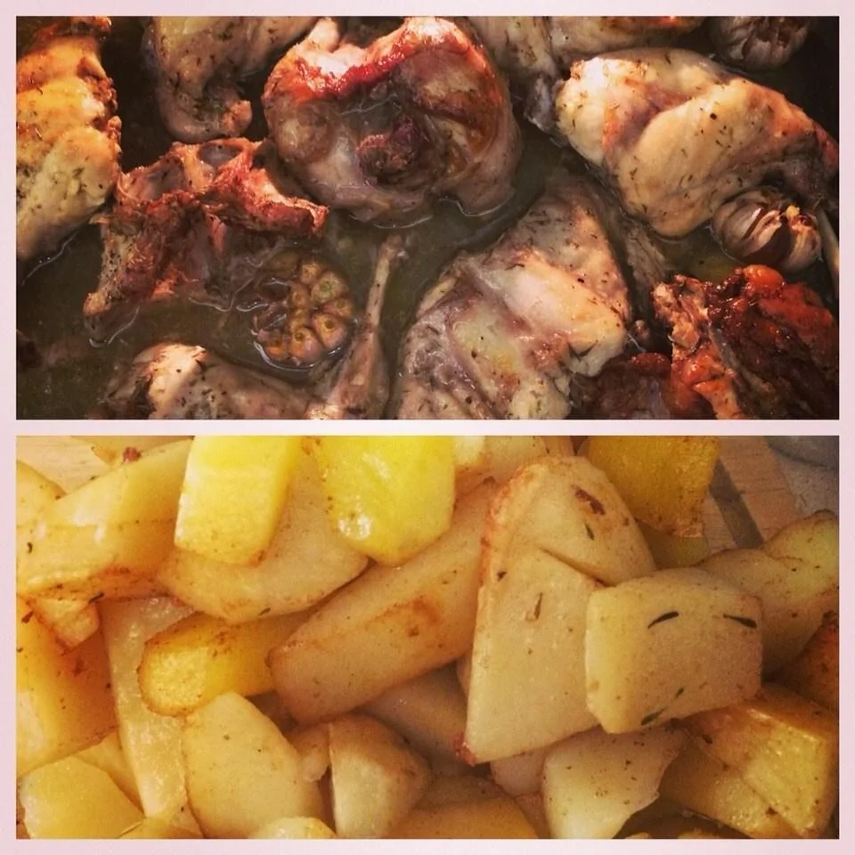ШАГ 3 Через три часа переложить кролика на противень (скорее на два, на один может не поместиться), пересыпать ломтиками сырой, посыпанной солью картошки и головками чеснока — и поставить в духовку, разогретую до 180 градусов на сорок минут.