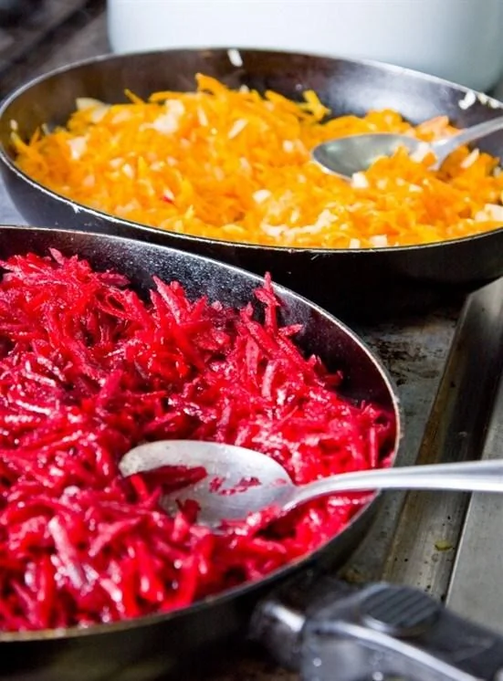 ШАГ 1 Почистите и ополосните свеклу. Помойте и почистите морковь. Нарежьте овощи соломкой, добавьте мелко порубленный корень петрушки или сельдерея. Положите овощи в кастрюлю, добавьте растительное масло и уксус, залейте все небольшим количеством воды, перемешайте. Закройте кастрюлю крышкой и тушите овощи в течение 45–60 минут, периодически помешивая и следя за тем, чтобы они не пригорели.