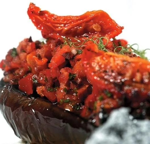 ШАГ 3 Выложить внутрь баклажанной половинки сальсу, сверху устроить ломоть вяленого томата и подавать, по желанию, с пеплом из баклажана.