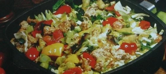 ШАГ 7 Половину пассерованных овощей уложить ровным слоем в смазанную маслом глубокую сковороду, сверху уложить слой мясного фарша и на него — оставшиеся пассерованные овощи.