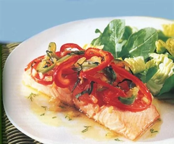 Ингредиенты для приготовления Запеченный лосось под болгарским перцем и помидорами: