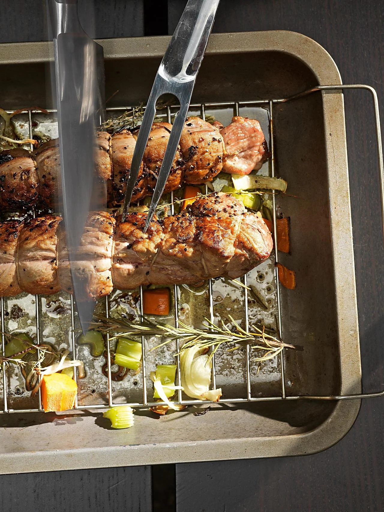 ШАГ 4 Выложить свинину на противень, добавить овощи и розмарин и отправить на двадцать минут в духовку, разогретую до 180 градусов.