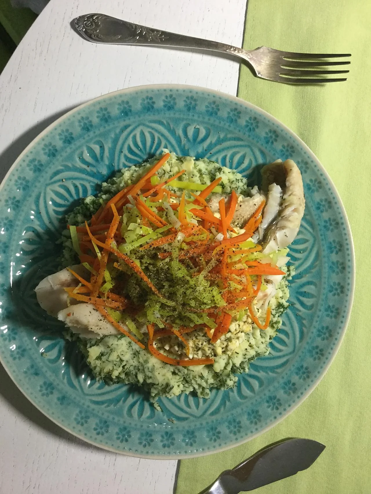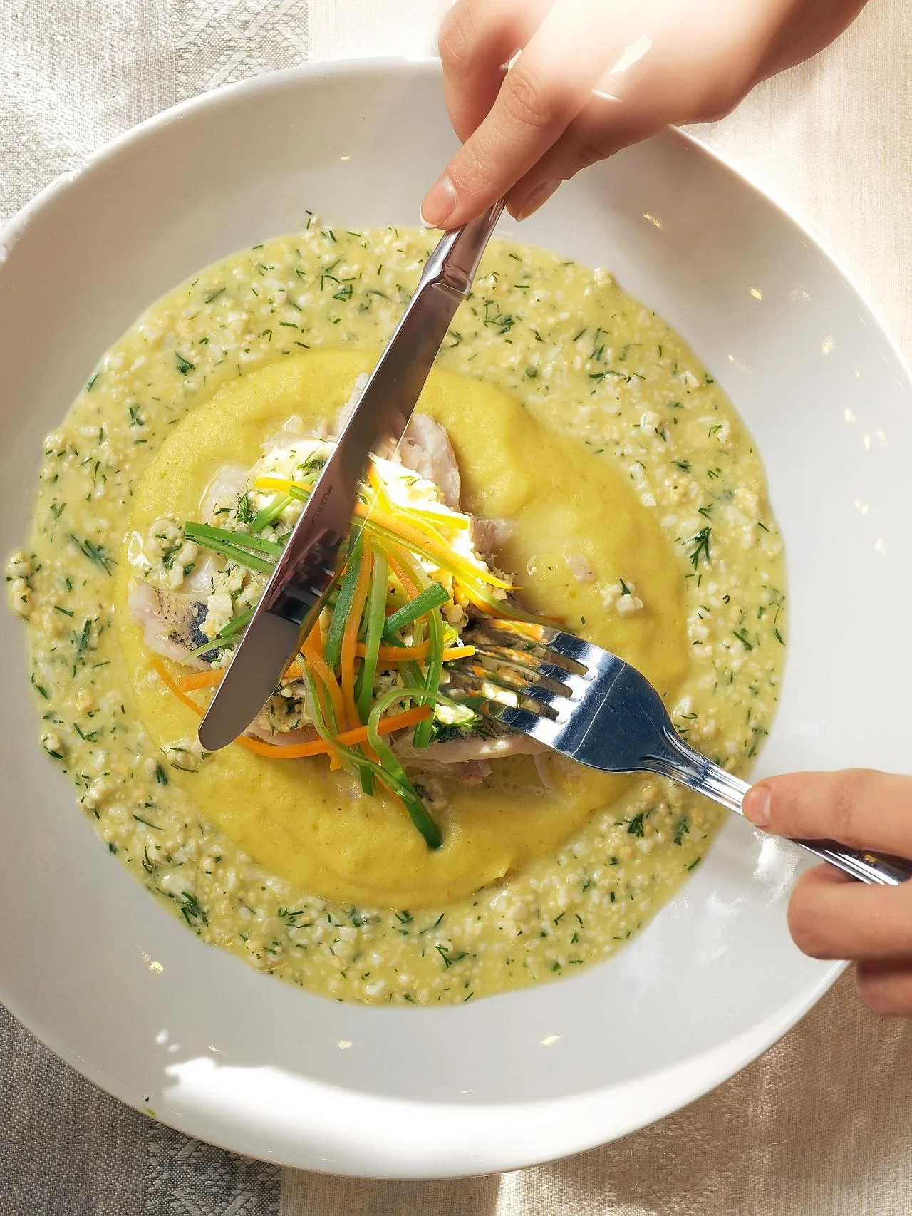ШАГ 6 На картофельное пюре выложить рыбу, на рыбу — соломку порея и моркови и полить соусом.