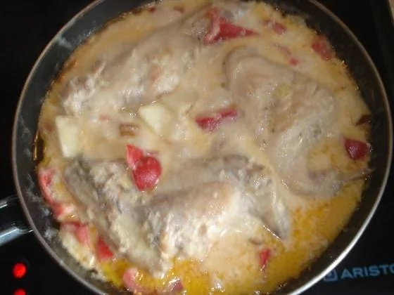 ШАГ 3 Убавляем огонь на 2 (электрическая плита), добавляем в ту же кастрюлю нарезанный мелко лук и чеснок. Обжариваем минуты 4, далее кладем морковь, нарезанную небольшими кружочками, болгарский перец кубиками и куски нашего крола. Все перемешиваем и вливаем 250 грамм сметаны, затем накрываем крышкой (плита — на 2).