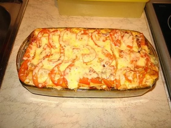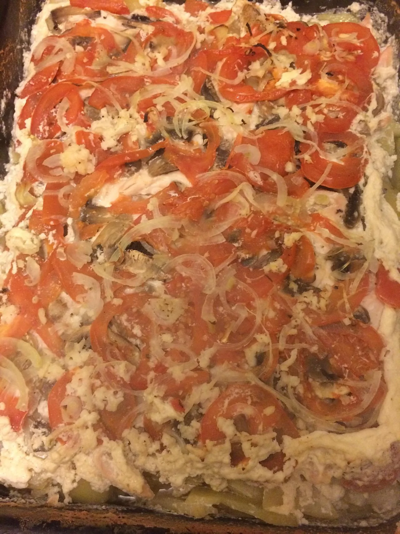 ШАГ 2 Выкладывать все слоями: кружочек картошки — помидор — картошка — лук — картошка — гриб. И так, пока все ингредиенты не закончатся.