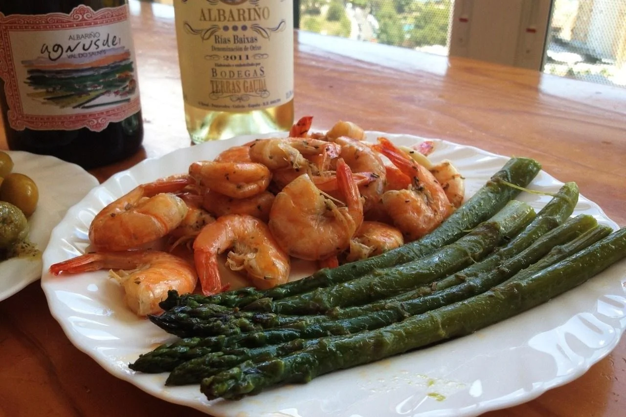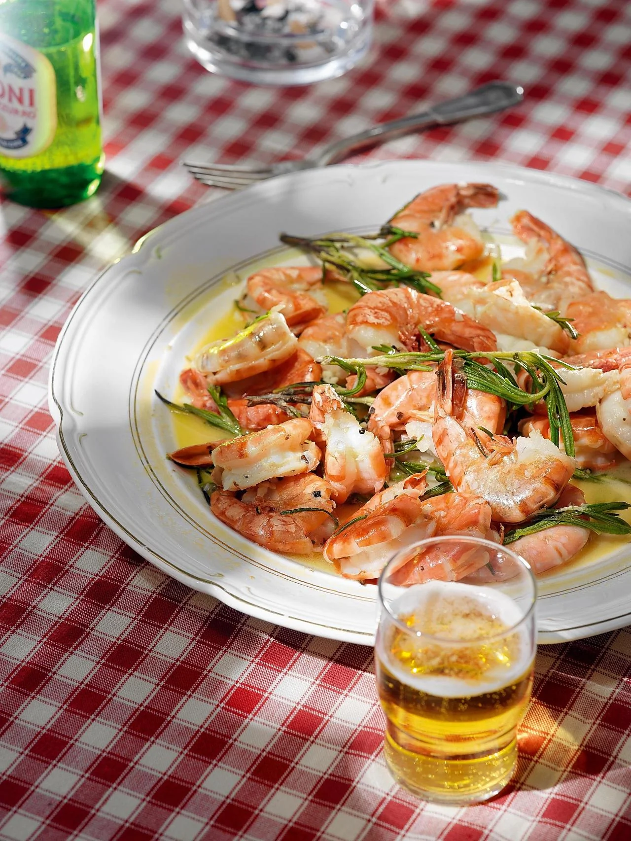 ШАГ 2 На большой сковороде разогреть оливковое масло, бросить в него розмарин и креветки. Обжаривать их с двух сторон до характерного розового цвета, после чего добавить чеснок и жарить до характерного чесночного запаха. Тогда плеснуть вино, куриный бульон и положить кусок сливочного масла, чтобы придать соусу тело. Посолить, поперчить и тушить креветки три-пять минут.