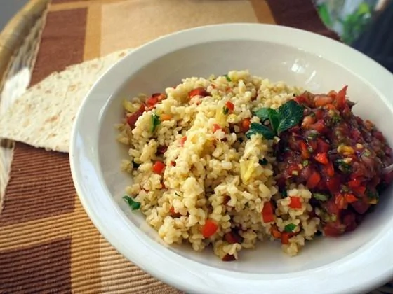 ШАГ 2 Когда булгур готов, кладем к нему еще и мелко нарезанный болгарский перец, оставляем томиться на 10 минут.