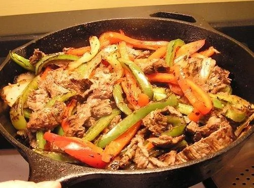 ШАГ 4 Тонко нарезать мясо поперек волокон. Выложить его в блюдо с перцем. Посолить и перемешать.