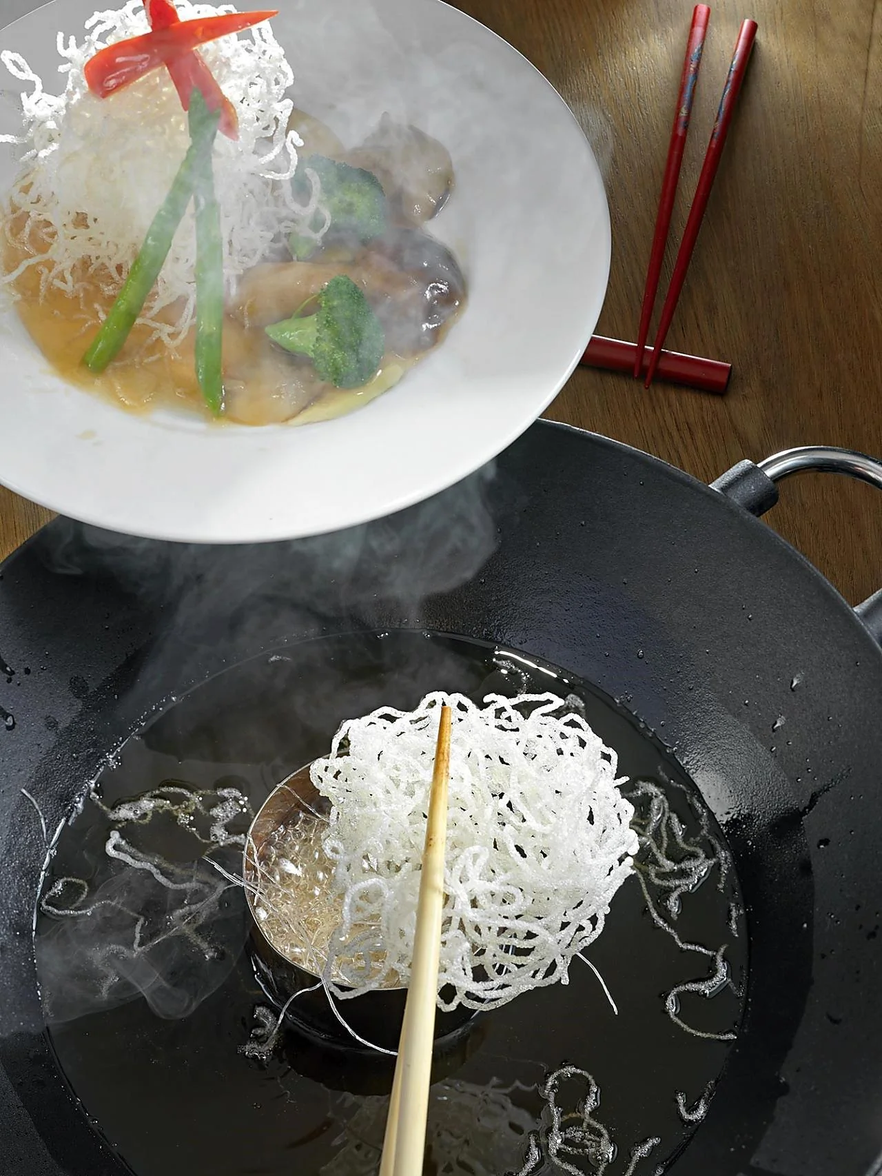 ШАГ 2 В центр вока поставить высокое кулинарное кольцо диаметром 7–8 см. Рисовую лапшу разделить на две части, опустить каждую в кольцо с маслом на полминуты — получатся пышные шары, напоминающие не то птичьи гнезда, не то перекати-поле. Выложить их на салфетку.